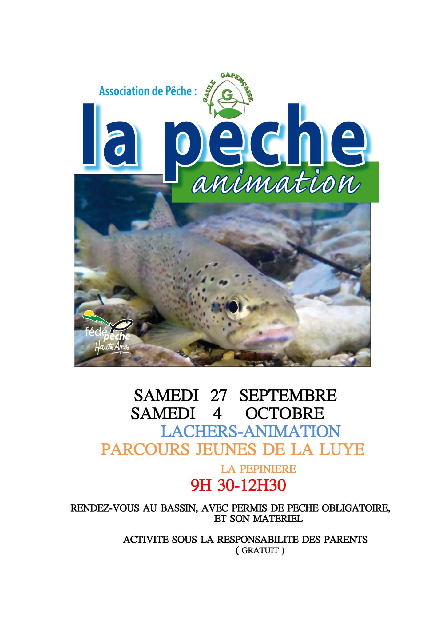 Ce samedi 4 octobre 2014, l’association de pêche « La gaule Gapençaise » invite les jeunes pêcheurs à un « Lâcher-animation pêche » sur le parcours jeunes de la Luye en plein centre de Gap – la Pépinière.